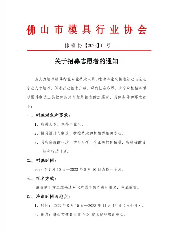 為大力培養(yǎng)模具行業(yè)專業(yè)技術(shù)人員,推動畢業(yè)生精準就業(yè)與企業(yè)專業(yè)人才培養(yǎng),促進行業(yè)技術(shù)升級?,F(xiàn)向社會各界、大專院校招募學習模具制造工具軟件應用與教練技術(shù)的志愿者,具體條件和要求如下: